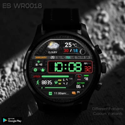 FEATURES ● Colour variants ● Different patterns ● One tap to open apps ● 12/24 H (Based on your phone time setting) ● Always on display supported ● Distance / Km – Mil supported ( Automatically selected based on phone language ) ● Steps – Heart rate ● Calories ● Complexity