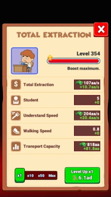 - Click on each floor to open the “Overview” or “Total Extraction” panel: see the speed of understanding the lesson, moving speed, capacity, number of students…