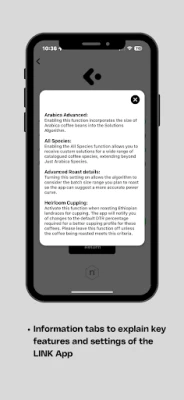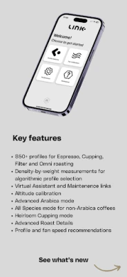 The Link App also has several features to accommodate different coffee roasting scenarios, including Altitude Calibration, Arabica Advanced to input the screen size of coffees, All Species Mode for non-Arabica coffees, Advanced Roast Details for roast batch size, and Heirloom Cupping for landrace varieties.