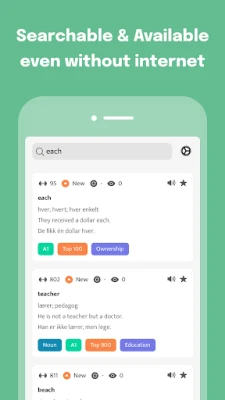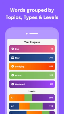116557 example sentences to put words into context, with pronunciations Filter by Levels (A1, A2, B1, B2), Topics, Top 100 Groups, and Parts of Speech Study without even opening the app, even on your watch, with flexibly scheduled notifications Flashcard autoplay and auto-pronounce loops over your flashcards for times when you cannot use your hands Practice with your favorite quiz types to master all words