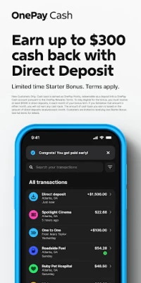 ∆3.75% annual percentage yield (APY) applies to the Savings balance of OnePay Cash accounts that have either (i) received $500+ of Direct Deposits in the current or previous month or (ii) have a balance of $5,000+ at the end of the previous month. 3.75% APY is also earned on Pay Autosave and ONE@Work Save balances without deposit or balance requirements. 3.75% APY is limited to a total Savings balance of up to $250,000. All other Savings balances will earn 1.00% APY. APYs are as of 12/20/2024, but may change at any time before or after account opening.