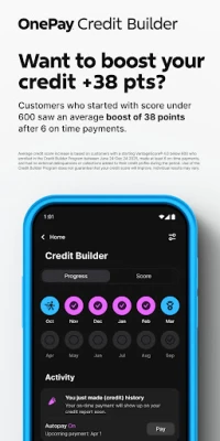 +Use of the Credit Builder Program does not guarantee that your credit score will improve. Credit score improvement is dependent on your specific circumstances and a variety of factors, including your financial behavior. Failure to make monthly minimum payments on time may negatively impact your credit score. Credit Builder is available to OnePay Cash accounts that have either (i) received Direct Deposits totaling $500+ in the current or previous month, or (ii) have a balance of $5,000+ at the end of the previous month. Participation is subject to eligibility. See OnePay.com/Legal/Licenses.