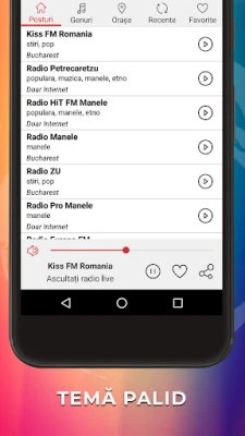 Puteți căuta în lista posturilor populare din România pe telefon folosind filtre precum genul sau orașul. Lista posturilor radio este sortată în funcție de popularitatea postului în aplicație. De îndată ce v-ați selectat postul favorit și ați apăsat play, aplicația va continua să funcționeze în fundal în timp ce sunteți liber să vă folosiți telefonul.