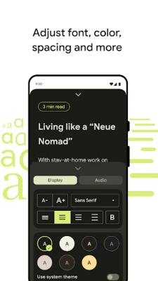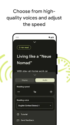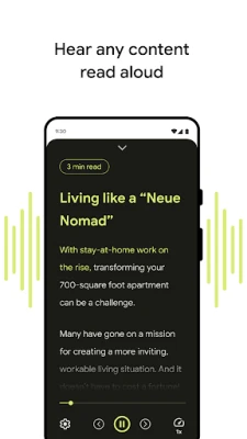 • Text-to-speech: Hear written content read out loud to you at the touch of a button. Choose from a selection of high quality long-form voices. Easily accessible audio control options to rewind, fast forward, and change reading speed on the go