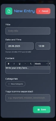 Keep a detailed game log of your RPG sessions. Includes calendar view, search function, and the ability to highlight key events.